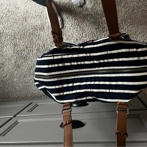 Stylish navy and white striped weekender bag with brown accents. Includes lots of pockets and shoulder strap! Perfect for that few days away!