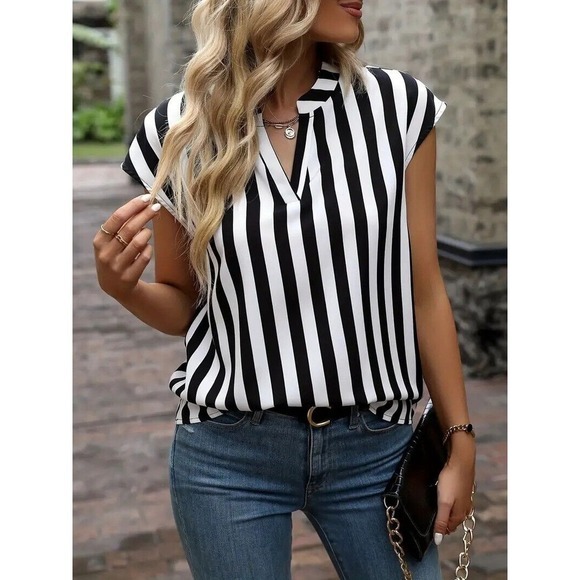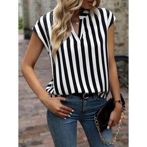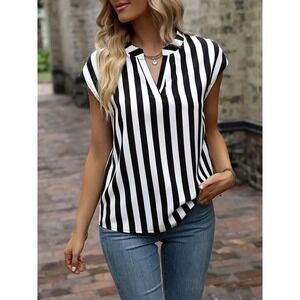 Striped Notched Neck Blouse, Casual Short Sleeve Blouse For Spring & Summer, Wom