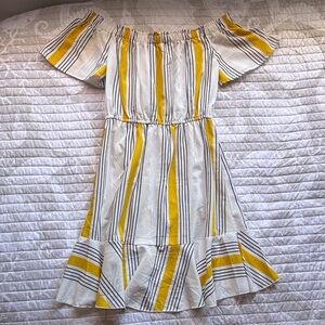 Embrace summer vibes with this chic off-shoulder dress. Featuring vibrant yellow and classic white stripes, it's perfect for any occasion. Stay stylish and comfortable all day long.