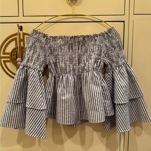 Elevate your style with this chic striped off-shoulder ruffle skirt. Perfect for any occasion, this blue and white skirt adds a touch of elegance to your wardrobe.