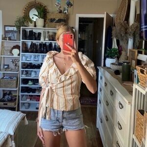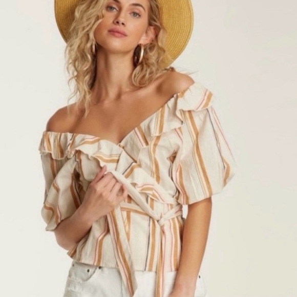 Elevate your style with this chic off-shoulder ruffle top. Featuring a stylish striped pattern in cream and tan, this top is perfect for any occasion.