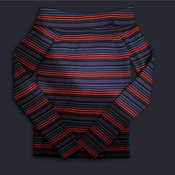 Stylish off-shoulder top with colorful stripes. Perfect for casual outings.