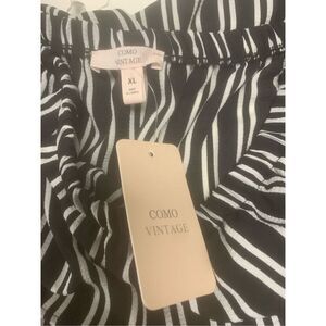 Ladies super cute black and white striped off the shoulder ruffled island girl style dress by Como Vintage. New with tags. Ladies size XL.