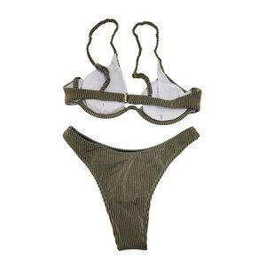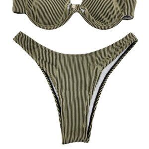 Striped Olive Green Womens Swimsuit Bikini Set Padded Top High-Cut Bottoms SZ M