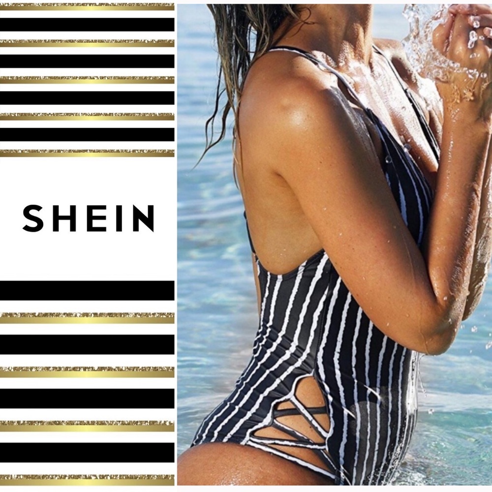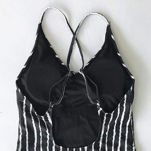 CupShe Deep V One-Piece Swim. Vertical black and white strips. Tastefully cheeky, Lace-ups by hip. Racerback, with adjustable straps. Removable padding.