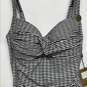 Stylish black and white striped one-piece swimsuit with ruched detailing. NWT