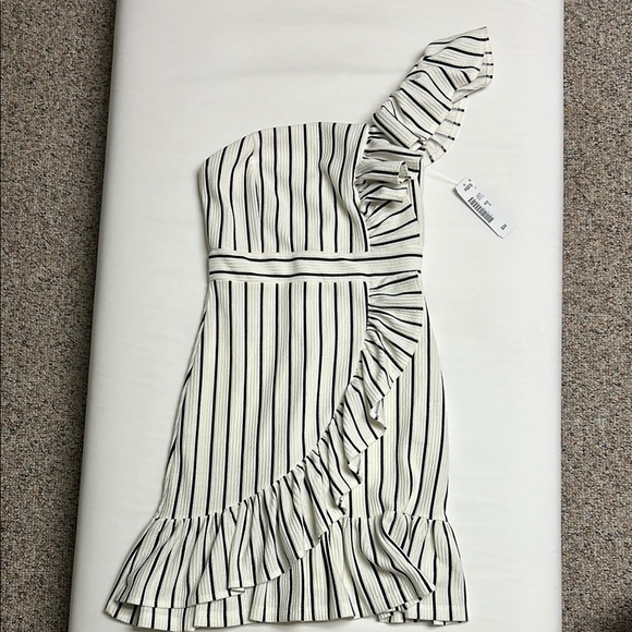 Chic one-shoulder dress with black and white stripes. Features elegant ruffle details.