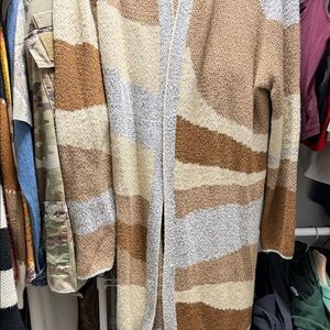 Stay cozy and stylish with this striped open-front cardigan. Featuring a blend of neutral tones, it's perfect for layering over any outfit.
