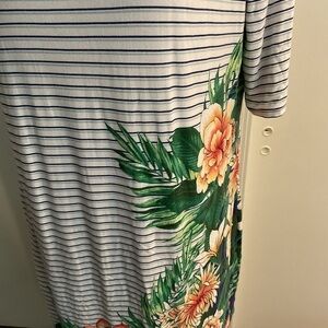 This beautiful striped palm dress is perfect for any occasion. The dress features a round neckline and 3/4 raglan sleeves, giving it a hippie vibe. The knee-length A-line dress is made of lightweight spandex and rayon material, making it comfortable and stretchy.