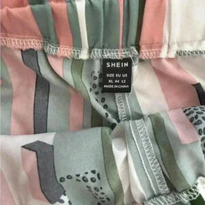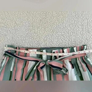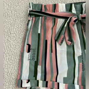 Trendy paperbag waist shorts featuring a bold striped design in a mix of pink, green, white, and black. These shorts include a matching tie belt for a flattering fit and a comfortable elastic waistband. Lightweight and stylish!