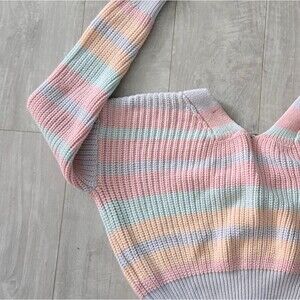 Cozy and cute pastel striped cardigan sweater in size Small. Features a button-front closure, ribbed cuffs and hem, and soft knit fabric. Colors include pink, mint, lavender, peach, and white – perfect for layering year-round.
