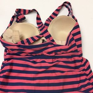 Enjoy the beach in style with this chic striped pink and blue swimsuit. Perfect for a sunny day by the water.