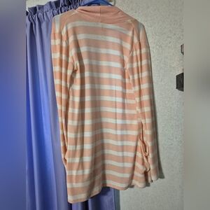Stay cozy and stylish with this striped pink and white women's sweater. Perfect for layering and adding a pop of color to your outfit.