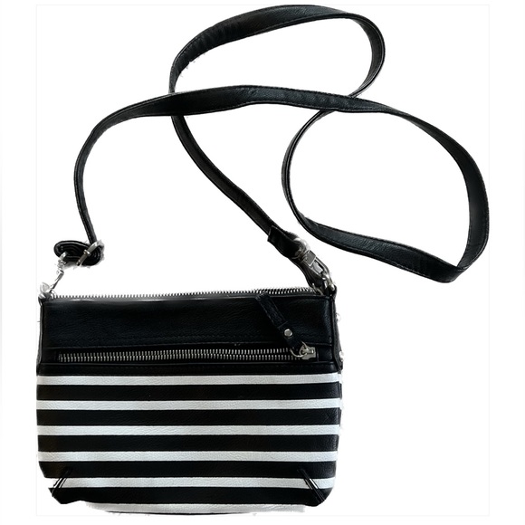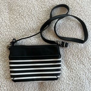 Super cute black and white striped crossbody purse from Merona. Only used once or twice, it’s in great condition. 9” wide by 6.5” high. Adjustable strap goes up to 50”. Zippered outside pocket one one size and open outside pocket on other side. Main compartment zips and has a small inner zipped pocket as well. Comes from a smoke free home. Please reach out with any questions!