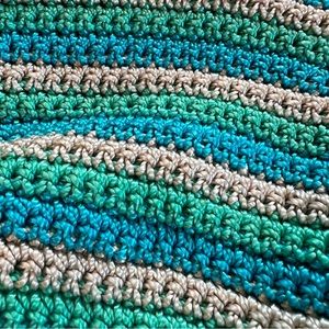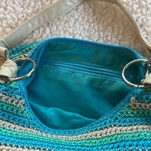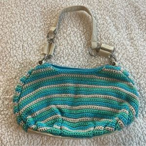 Super cute knitted style purse with colors that give off ocean vibes. Only used a few times so it’s in great condition. Strap and bottom panel are cream faux leather. Laying flat it measures 13” wide by 6.5” high. Comes from a smoke free home. Please reach out with any questions!