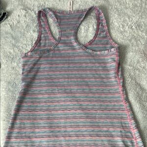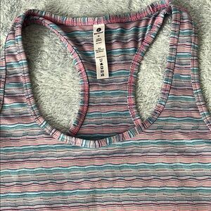 Stylish racerback tank top with colorful stripes. Perfect for casual wear.