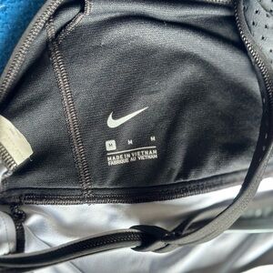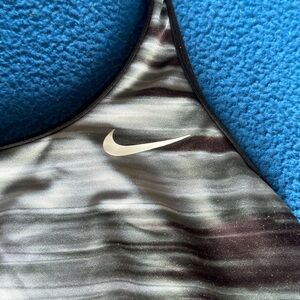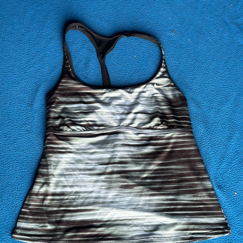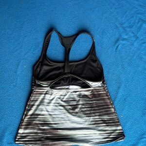 Stylish racerback tank top with a striped pattern. Features shades of black and gray.