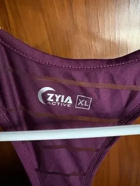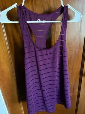Plum-colored racerback tank with subtle horizontal see through stripes. Breathable, lightweight. Smooth finish and clean lines. Great for workouts or layering.