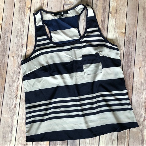 Gray and navy blue stripes • sleeveless tank top • front pocket • approx measurements when laying flat: bust 17.5”, length 23” • accepting all reasonable offers!