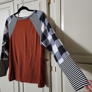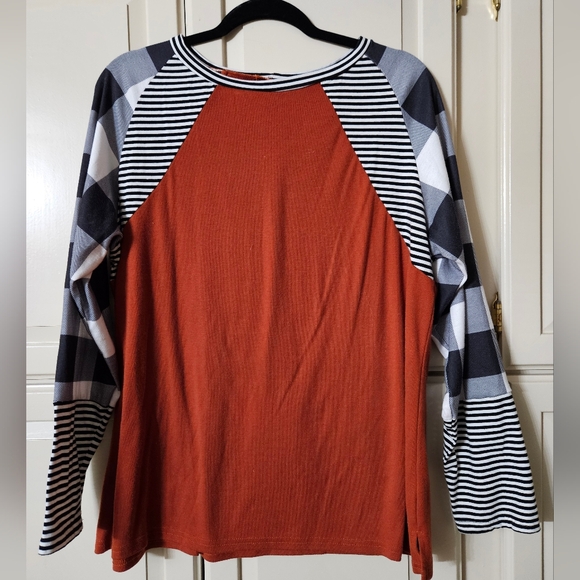Stylish top with striped raglan sleeves. Features a bold color contrast.