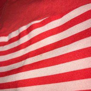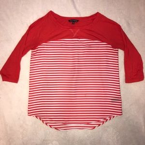Cute casual raglan style top. A few small marks on it. The body (striped) portion is 100% polyester, and the solid top part is 60% cotton, 40% modal. Previously loved, but lots of life left!