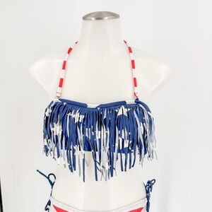 Dive into style with this chic striped bikini featuring a playful blue fringe top and vibrant red bottoms. Perfect for making a splash at the beach or pool.