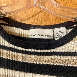 Stylish ribbed knit top with navy blue, white, and cream stripes. Perfect for casual wear.