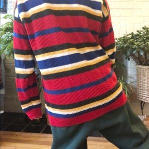 Amazing ribbed sweater with a red, yellow, blue, white and brown stripe pattern. 100% cotton, marked a size medium and shown on a small. Plenty of stretch.