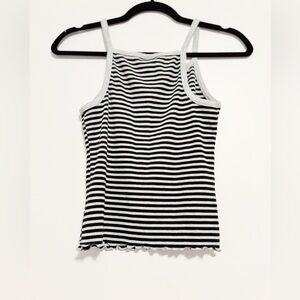 Black and grey spaghetti strap tank. Cute button details on front with a ruffled hem. Ribbed and stretchy material. Like new condition.