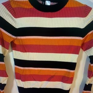 Colorful ribbed sweater with bold stripes. Features red, orange, cream, and black colors.
