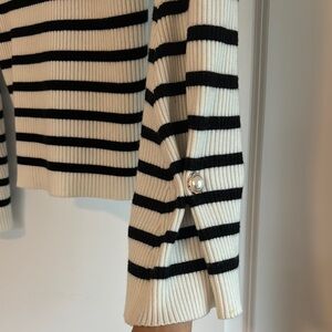 Stylish ribbed sweater with black stripes on a cream background. With beautiful button details. Perfect for casual wear.