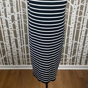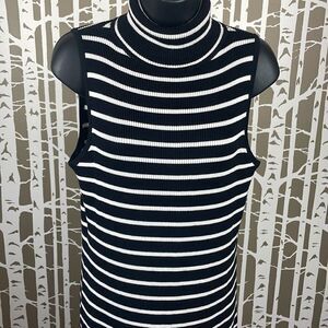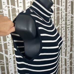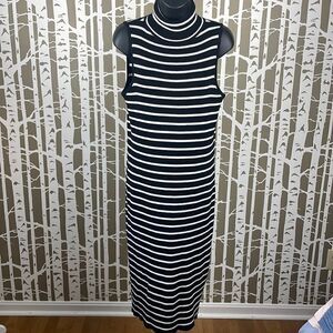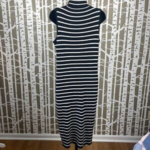 Ronni Nicole Black White Striped Ribbed Sweater Knit Turtleneck Sleeveless Midi Dress. Features super soft and stretchy ribbed sweater knit fabric, turtleneck, midi length. The fabric has a nice weight to it and you can tell it's a very nice quality dress - the ribbed texture provides a very smooth, figure flattering fit. Gently worn and clean with no flaws to note. See pics for measurements. Wear alone now or layered over turtleneck with some tall boots as the weather gets cooler. A very versatile dress that will be your go to comfy piece!!