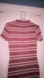 This dress is so comfy and has a light fabric not see through goes right above the knee. Does not ride up. The dress is a bit old, hense the size tag is gone. Time to pass her down to a new home closet! The size is a M/L, the color is burgundy and white stripes