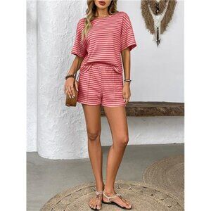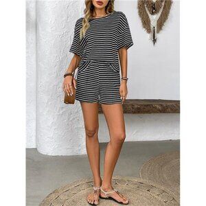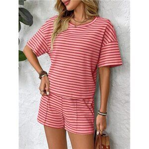 Striped Round Neck Short Sleeve Top and Shorts Set