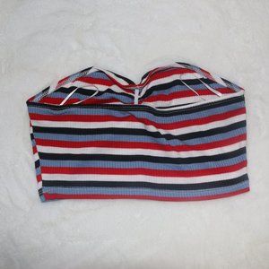 Red, white and blue (with black) striped ribbed crop tube top with ruching detail at the middle.