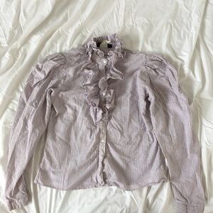 Vintage lilac and white striped blouse with ruffle details. Button down