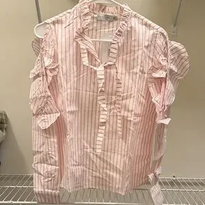 Elevate your style with this chic striped ruffle blouse. Perfect for any occasion, this pink top adds a touch of elegance to your wardrobe.