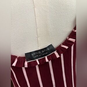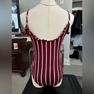 Striped maroon and white bodysuit with ruffle trim detailing. Size Small/ Medium.