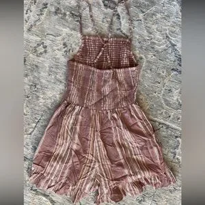 Never worn. Mauve striped romper with adjustable crisscross straps and pockets