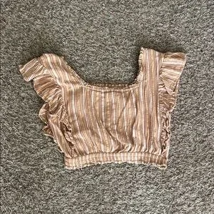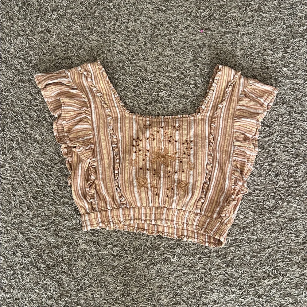 Stylish striped crop top with ruffle sleeves. Features intricate embroidery on the front.