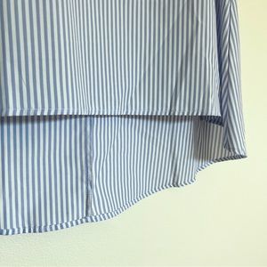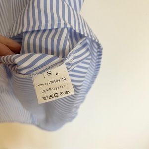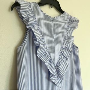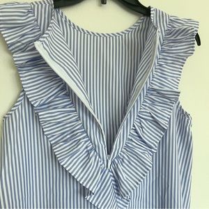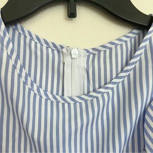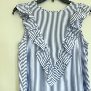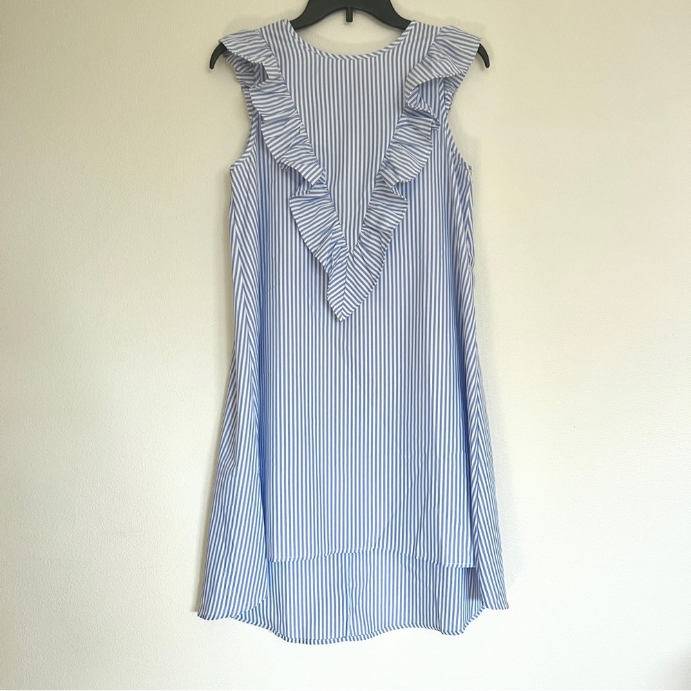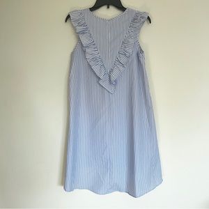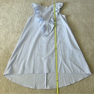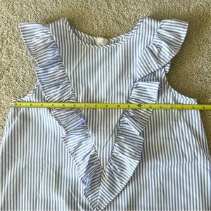 Adorable A-line vertical striped dress with a ruffle V detail down the front and matching on the back. This dress gives lots of room as it goes down! It’s longer in the back (about 38”) and shorter in the front (about 33”). There is a zipper in the back. Super cute! Would be great for a baby shower in the spring or summer, and I wore once to a bridal shower! 🤍🩵