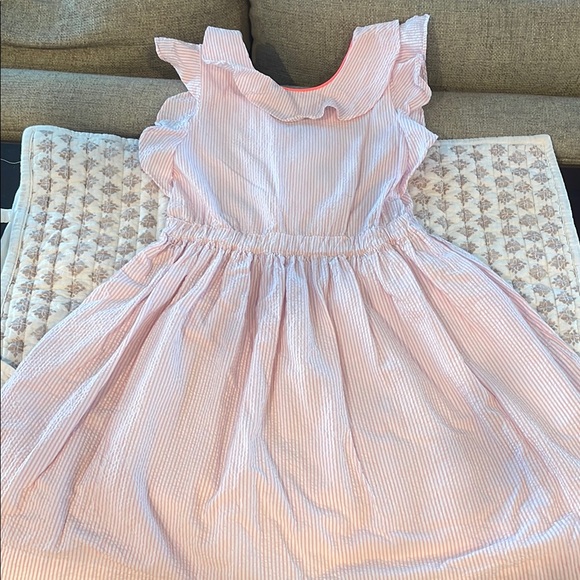 Charming pink and white linen dress with ruffle details. Features a subtle striped pattern. Perfect for casual outings, Easter, spring, summer events.