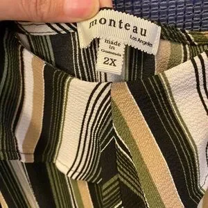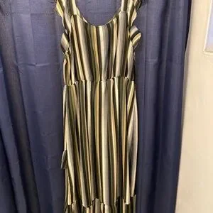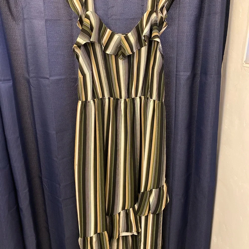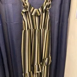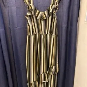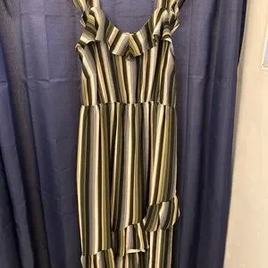 Chic striped dress with ruffle details. Features a mix of black, yellow, and cream stripes.