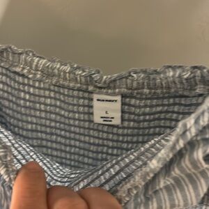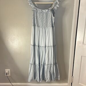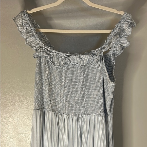Chic off-shoulder dress with ruffle details. Features a stylish striped pattern.