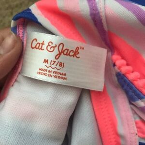 Colorful one-piece swimsuit with ruffle details. Features vibrant stripes in pink, blue, and purple.