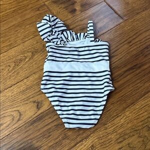 Stylish one-piece swimsuit with black and white stripes. Features a ruffle detail and a decorative ring. This suit is stunning