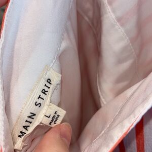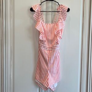 Romper has ruffles on the shoulders. Adjusts with string and zipper on the back