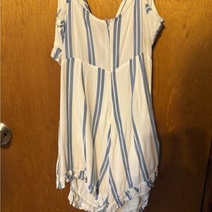 Chic dress with blue and white stripes. Features ruffle details and a stylish cut-out design.