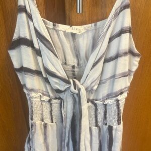 Chic mini dress with ruffle details. Features a stylish striped pattern.