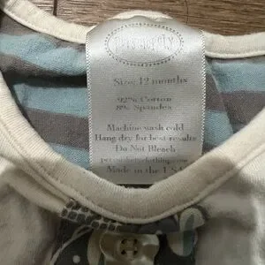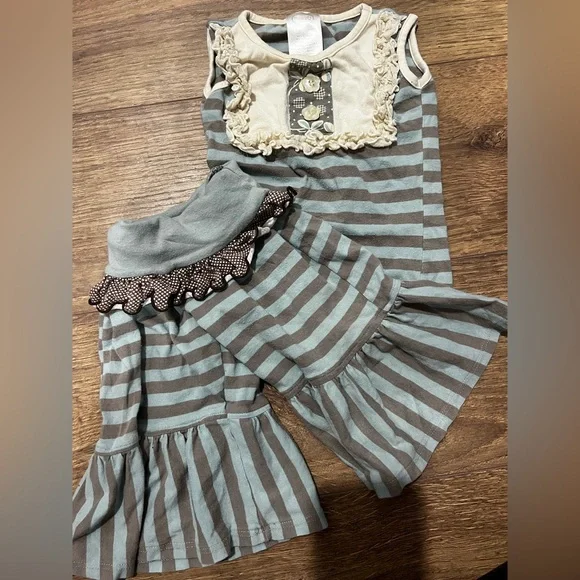 Persnickety Charming outfit with stripes and ruffle details. Features a decorative button design.